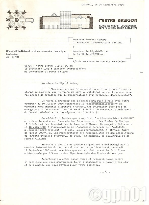 Il faut préciser qu'après 1987 je suis allé au tribunal administratif pour licenciement abusif, ce qui a fortement déplu "au prince" député -maire d'OYONNAX manquant pour le moins de fair play et d'ouverture culturelle.