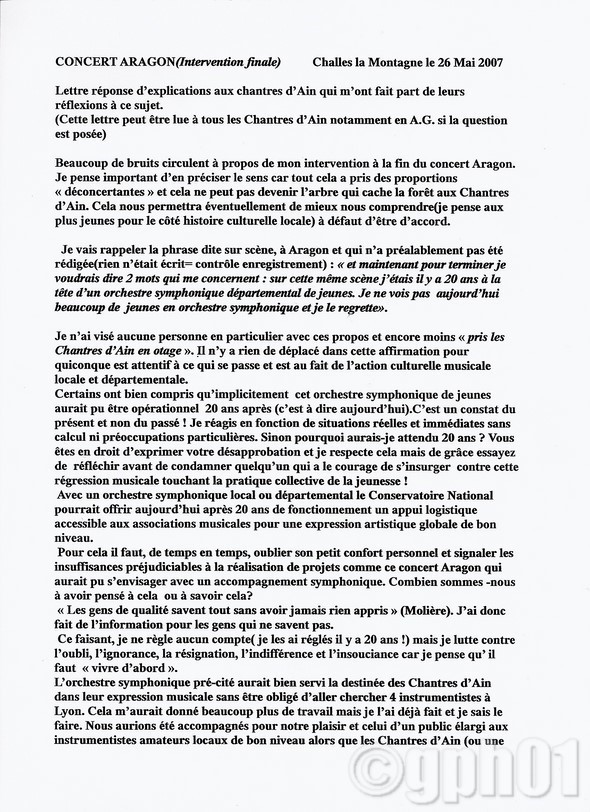 27 Avril 2007:Concert Chantres d'Ain==>intervention publique sur la scène du centre ARAGON à OYONNAX:page 1 du document