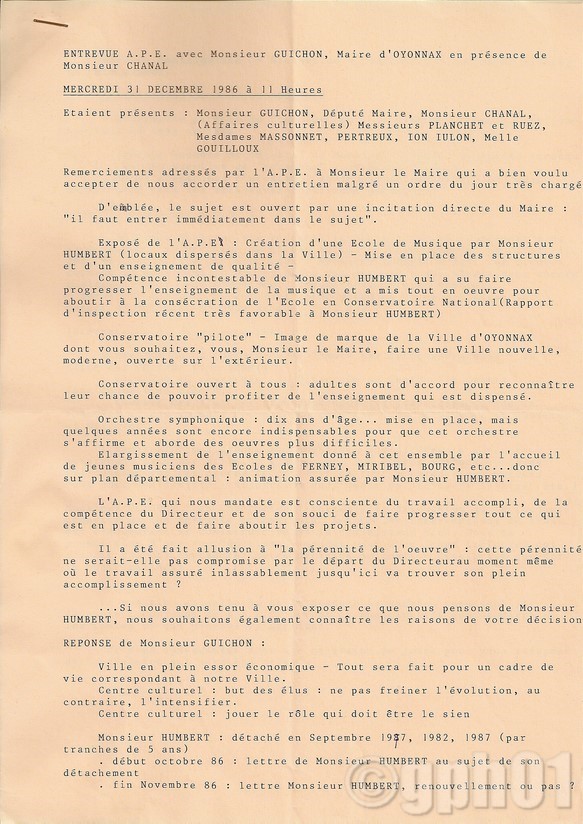 31 Déc.1986:Compte rendu de l'entrevue des parents d'élèves avec le député-maire. page 1 ( voir les commentaires avec la page 2)