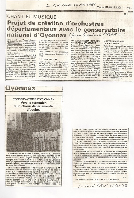Septembre 1986:je présente un projet départemental implicitement accepté par le Maire Adjoint à la culture d'OYONNAX lors d'une réunion A.D.E.M.01 à Bourg-en-Bresse