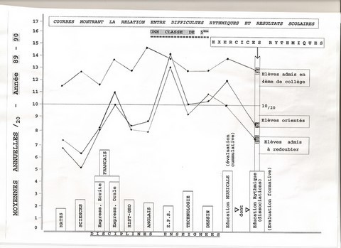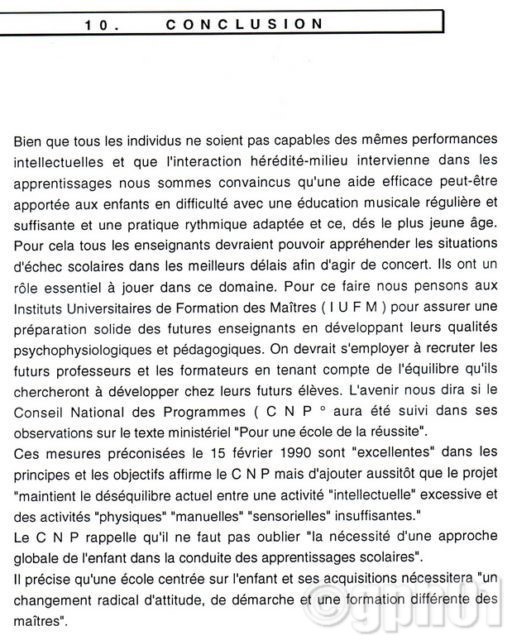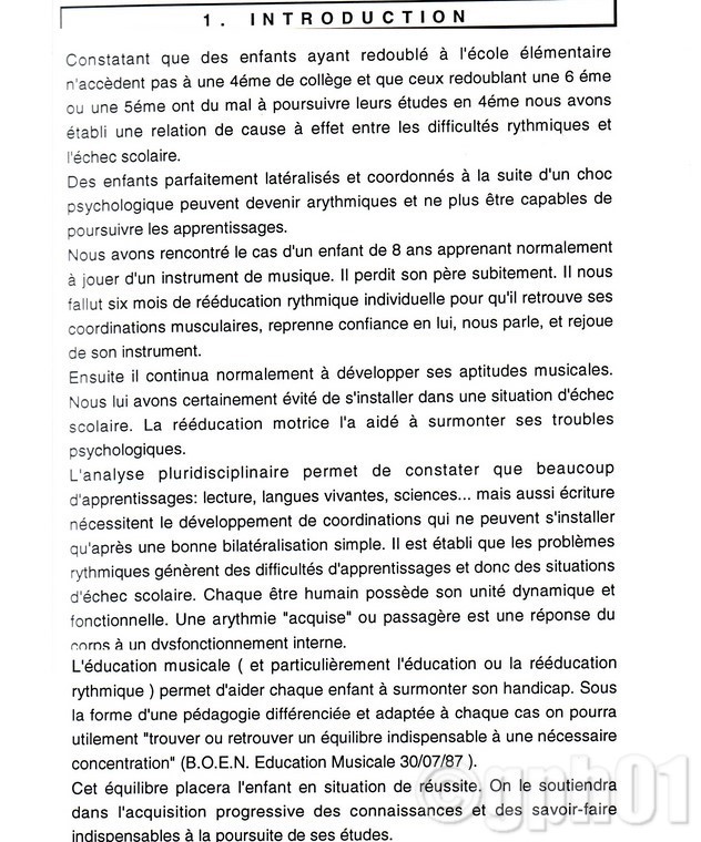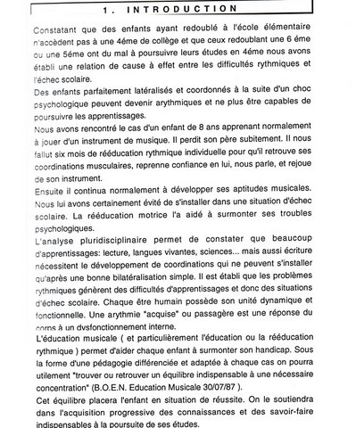 1990: double fracture de la colonne vertébrale et d'un bras: j'écris un mémoire sur les rapports entre les difficultés rythmiques, les difficultés d'apprentissages et l'échec scolaire suivant les observations effectuées à partir de mes activités d'enseignant. La faculté de Lyon section"Sciences Humaines " me propose de constituer à mes frais un pôle de recherche sur ce problème. Je ne donne pas suite d'autant que les sujets abordés dans ces observations sont "explosifs" par rapport au système éducatif français et au système de valeurs sociales.