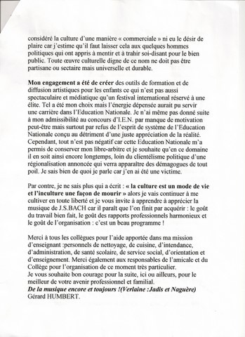1991: je suis admissible au concours d'Inspecteur de l'Education Nationale mais après des renseignements sollicités auprès de l'inspecteur local je ne donne pas suite. Je préfère continuer à me consacrer à l'enseignement et à la pratique musicale dans le monde associatif humainement plus intéressant que le monde professionnel trop souvent préoccupé par les destinées personnelles immédiates.