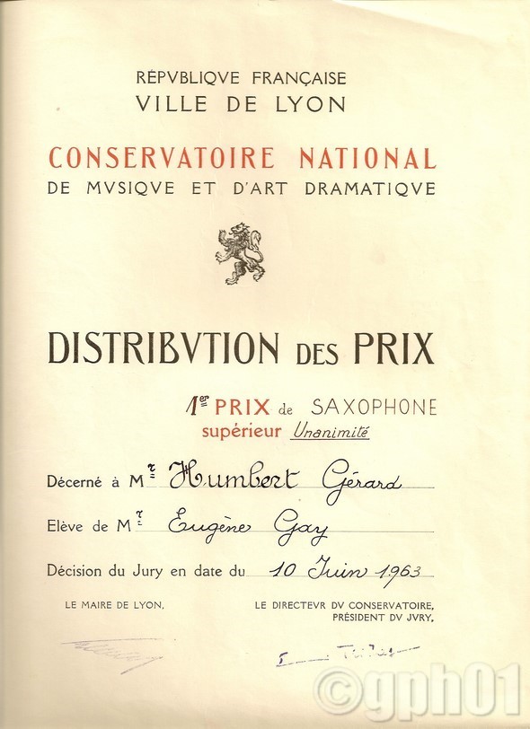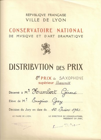 Tout en poursuivant une formation universitaire j'obtiens donc à l'issue d'une seule année d'études instrumentales au Conservatoire National, un premier prix de saxophone supérieur à l'unanimité du jury, premier nommé de cinq premiers prix dans la classe d'Eugène GAY, au concours de fin d'année (en 1963) . Avec la motivation de cette réussite inattendue (parce que pas du tout informé des niveaux des Conservatoires Nationaux) j'envisage de poursuivre une carrière musicale à Paris.