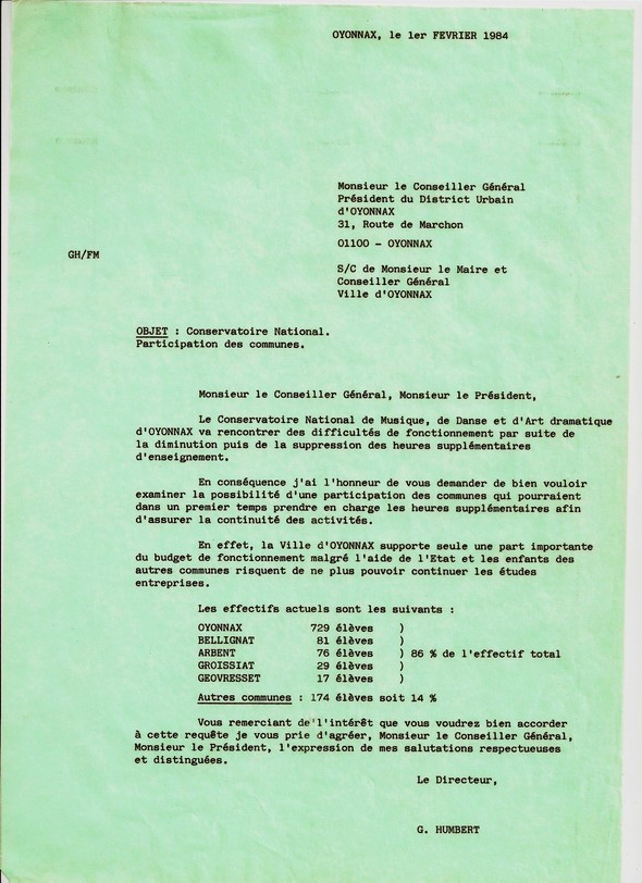 01 Février 1984:Comme directeur du conservatoire national je saisis le Président du district urbain afin solliciter une aide des autres communes en fonction des effectifs!