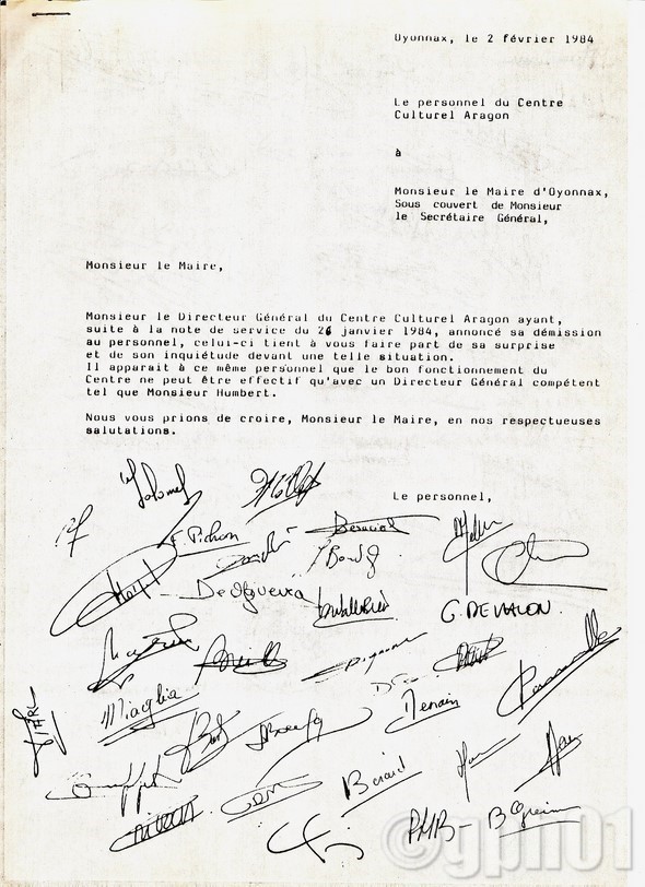 02 Février 1984:lettre de soutien de personnel du centre culturel au directeur général/62 signatures . page 1