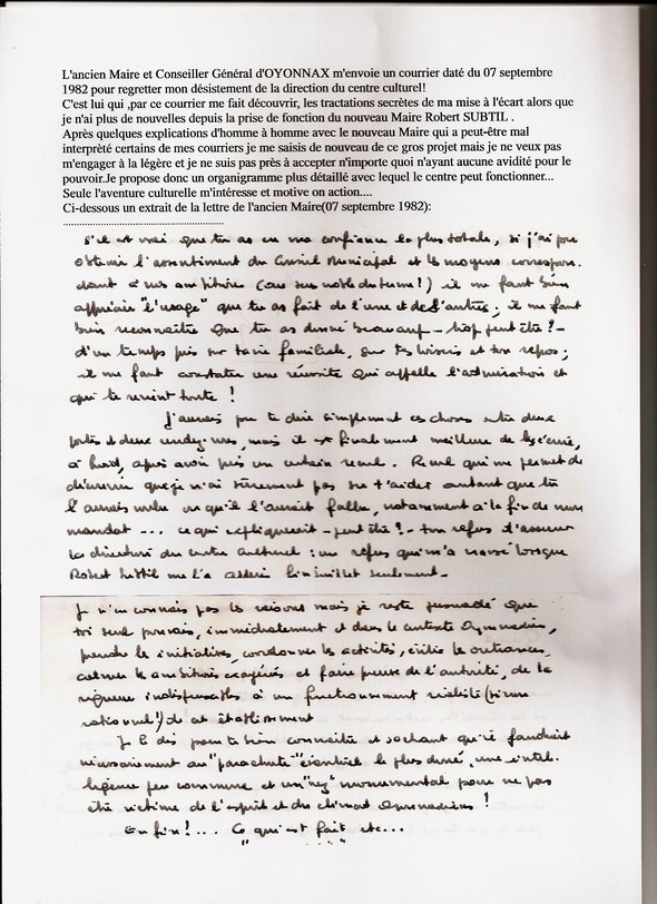 07 septembre 1982:Depuis le départ du maire Guy CHAVANNE,je n'ai plus de nouvelles du centre culturel ...et pour cause...(voir la lettre que l'ancien maire m'adresse le 07 septembre)!