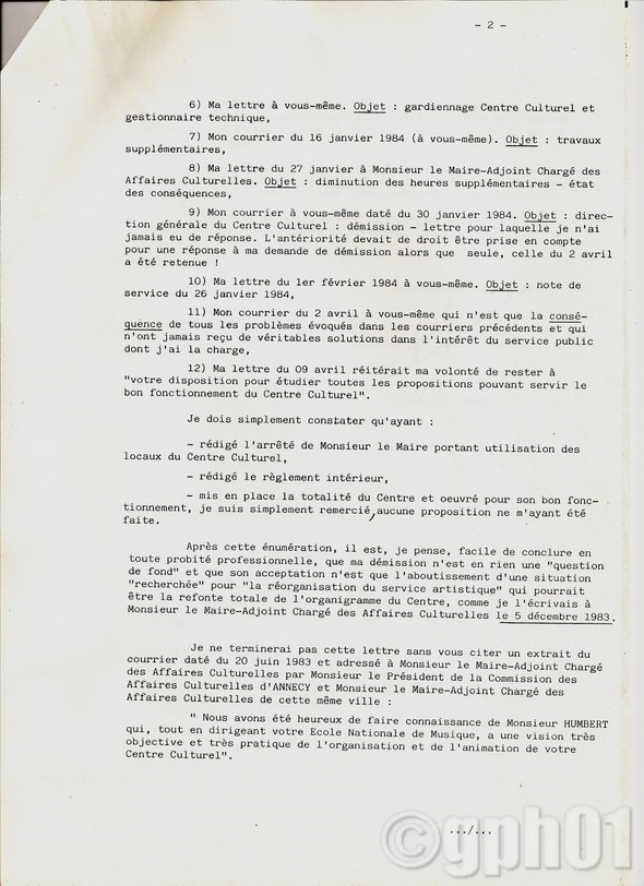 page 2:commentaires sur l'acceptation de ma démission et récapitulatif de mon action au centre culturel.