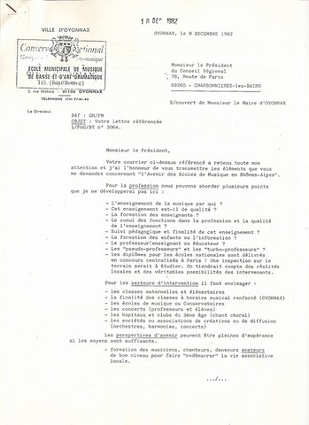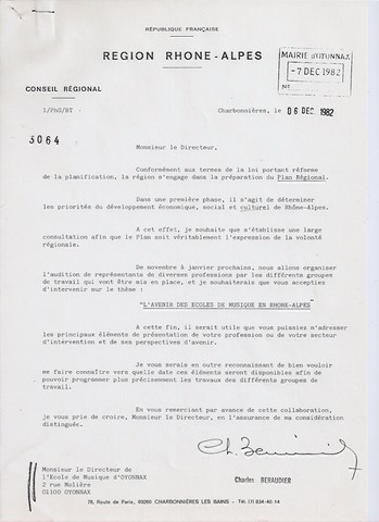 LE PRESIDENT DE LA REGION RHÔNE-ALPES sollicite le Directeur de l'Ecole Nationale d'OYONNAX pour l'Avenir des Ecoles de Musique en région