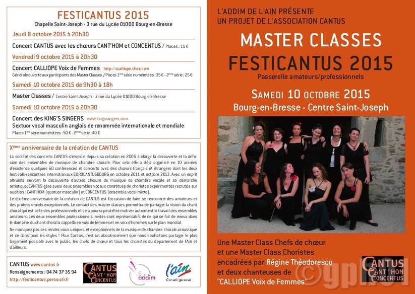 Master classes chant choral pour chefs de choeur et choristes programmées le samedi 10 octobre 2015 à Bourg-en-Bresse.